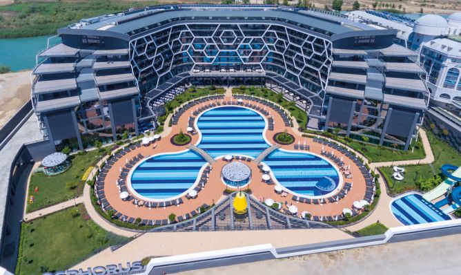 Собствен пясъчно-чакълест плаж на 250 м от хотела. Между хотела и плажа има автомобилен път, осигурен е безплатен превоз. На разположение на гостите са открит басейн с прясна вода 1258 кв.м (отопляем през април и май), 1 закрит басейн с прясна вода 140 кв.м (отопляем през студения сезон: април, май, октомври). 3 водни пързалки.