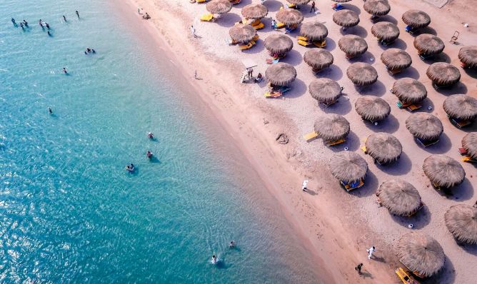 Собствен, пясъчен. Чадъри, шезлонги и матраци на плажа и при басейна - безплатно. Плажни кърпи – безплатно.