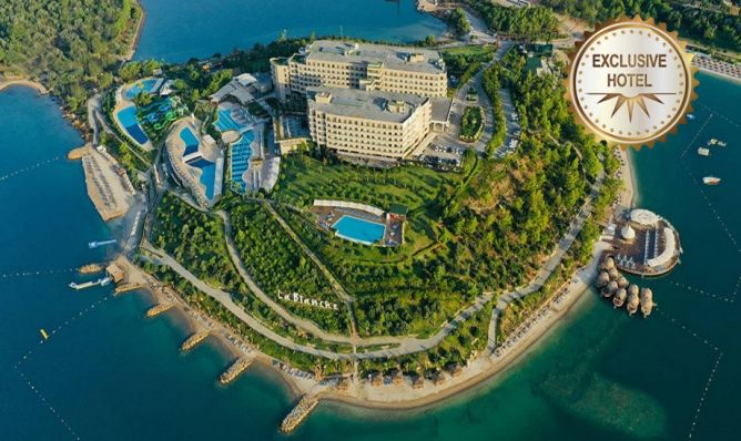 La Blanche Island се намира в уединен и много красив район на крайбрежието на Гюверджинлик с обща площ от 82 000 m². Включва собствена пясъчна ивица от общо 1200 м, и aква парк. Летище Милас Бодрум е на 15 км. Пред хотела има спирка за градски транспорт. Реновация през 2023/4 г на ресторантите, общите части и подобрена Ultra All Inclusive концепция.