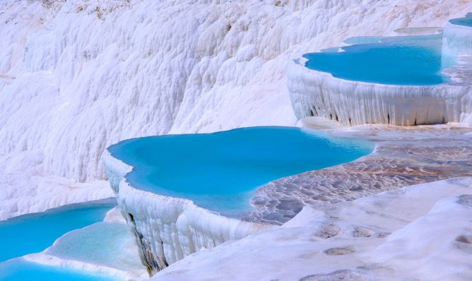 Посетете магическата и зрелищна природна местност, уникална в целия свят. Варовиковите отлагания от горещите минерални извори са облекли скалистите тераси в ослепителна белота. Оттам идва и името на Памуккале - "замък от памук". Разходете се из улиците на древния град Хиераполис и се върнете назад във времето, докато разглеждате храма на Аполон и Плутониум, портата на Домициан и главната улица. Не пропускайте да видите и античния театър, както и басейна на Клеопатра.