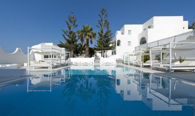 Хотелът се намира на 9 километра от летището, на 12 км от пристанище Athinios, на 15 км от живописното селище Oia, на 9 км от най-известният и добре организиран черен бряг на Камарата, в центъра на туристическото селище Фира. Местоположението на хотела е идеално за опознаването на Санторини и неговата уникална красота. Голяма част от бляскавите ресторанти, барове, магазини на централния площад в Фира се намират в непосредствена близост до хотела.